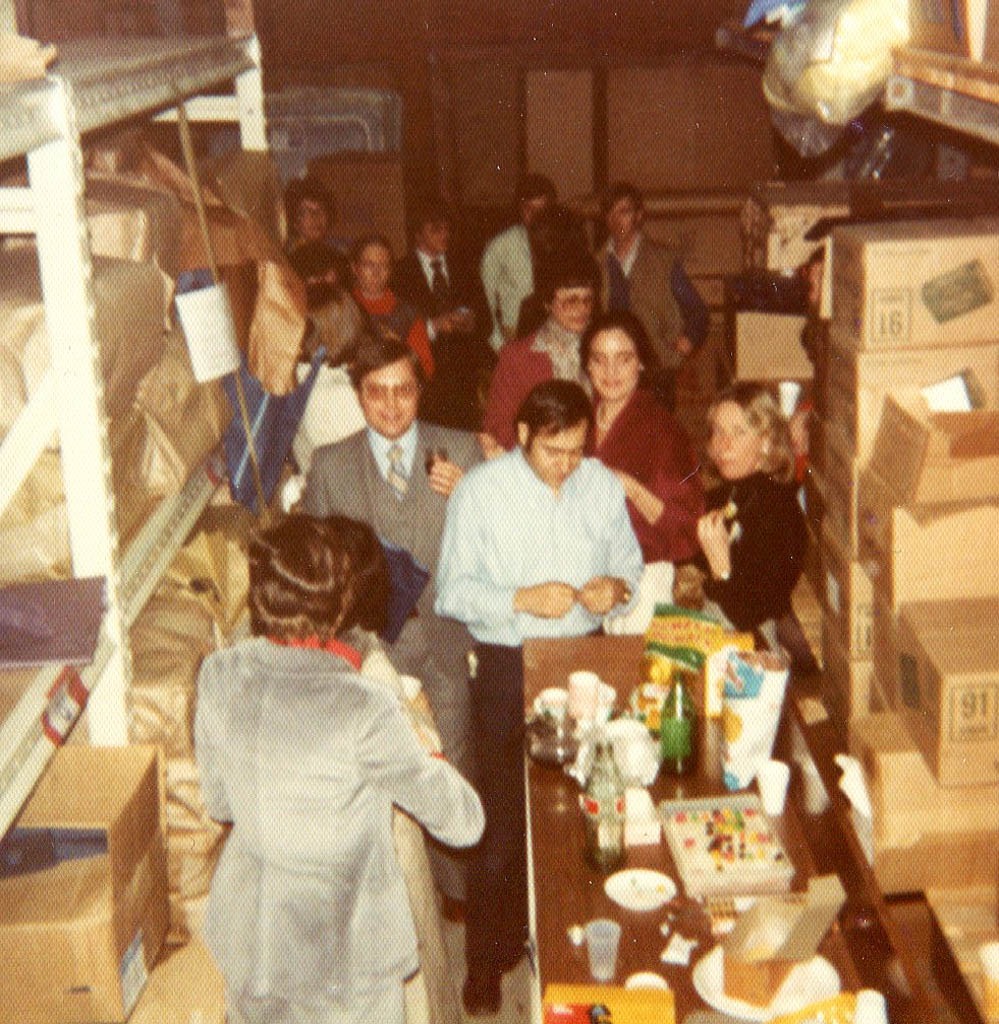 Christmas party in the Jordan Marsh stockroom, circa 1978. Instamatic photo/Hubley Archives.