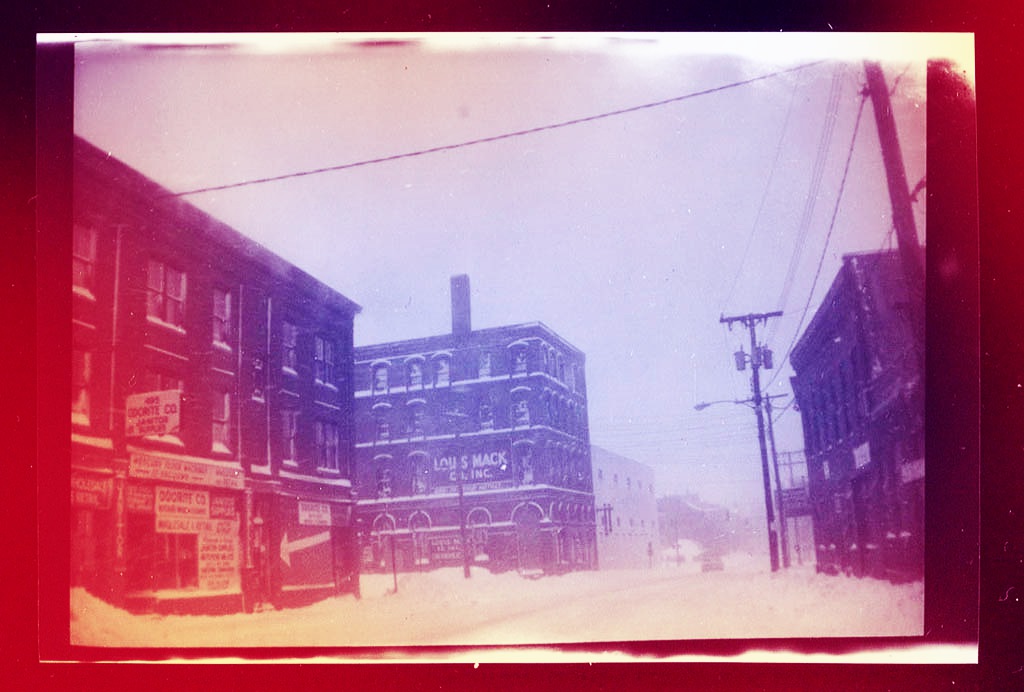 In a digitally colorized image suitable to the holiday season, here is Fore Street in Portland, Maine, early in 1982. The camera was a Kodak Brownie from the 1920s or ’30s that I kept in the Squareback. I was on my way to work in the clip library at the Guy Gannett newspapers on a Saturday morning. Hubley Archives.