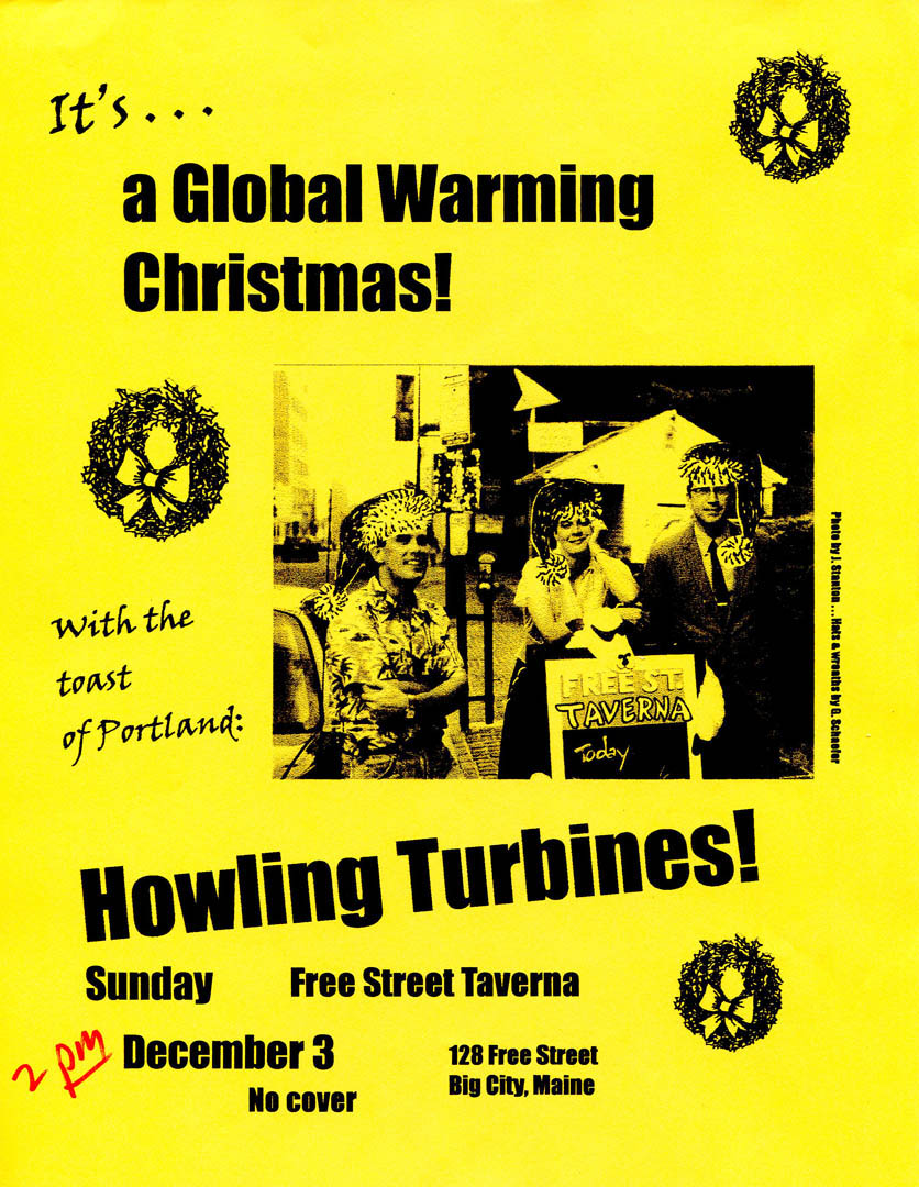 This Howling Turbines poster for a December 2000 date was a group effort. Gretchen Schaefer created the Santa hats to superimpose on Jeff Stanton’s image of the Howling Turbines, taken at the Free Street Taverna on a 90-degree day. I wrote and laid out the poster. Hubley Archives.