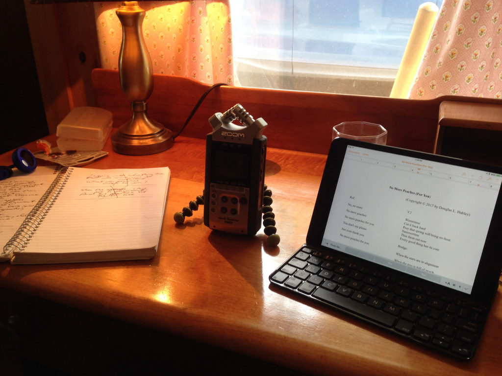 This kind of solo brainstorming is the only way I can produce a song. (I’ve always envied the detective novelist Rex Stout, who committed his Nero Wolfe stories to paper only after figuring out a detailed storyline in his head. In what could be a pretty good pun, he created his plots while working in the garden.)