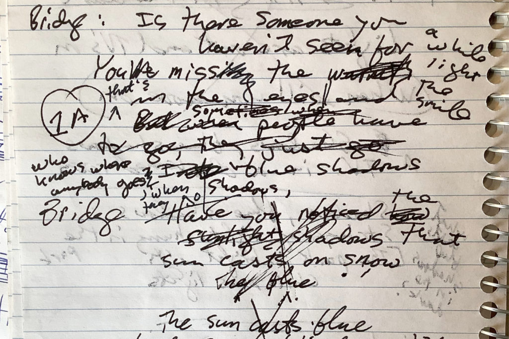 So into the yellow notebook, for instance, went lyric fragments and song ideas dating back to the 1970s. You could argue that if an idea hasn’t blossomed into a song after 50 years, perhaps it is just dead weight in my Earthwise notebook. But old ideas have sprouted more than once.