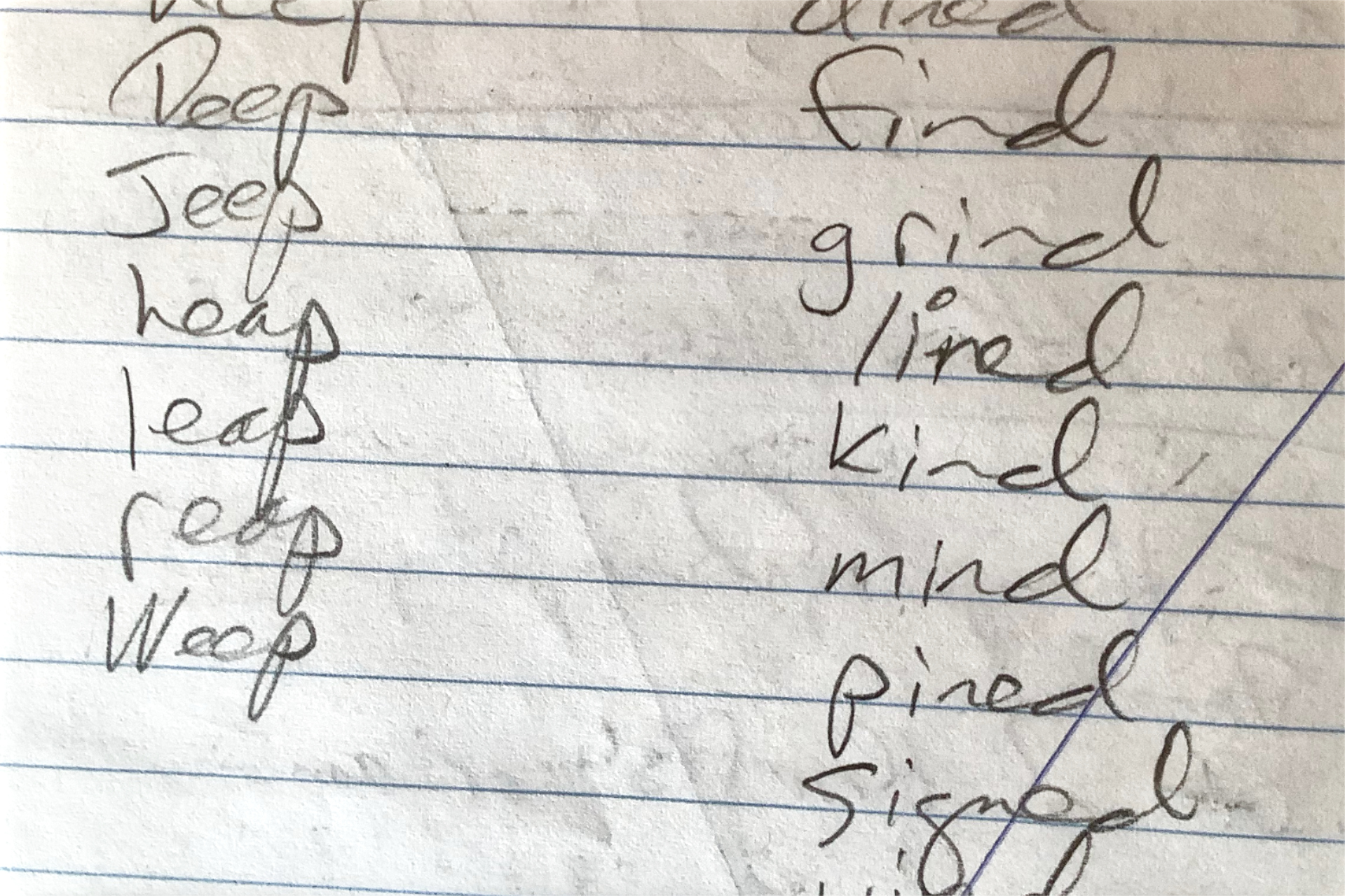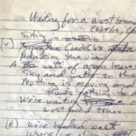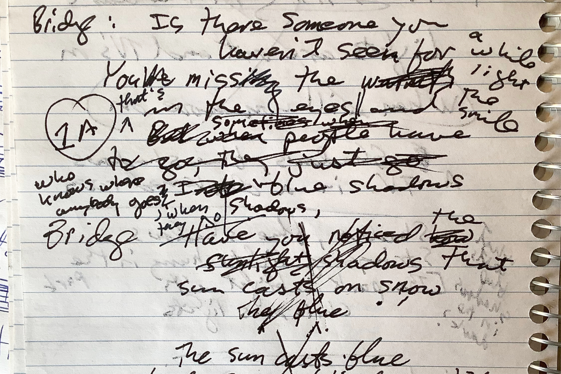 I referred above to the scribbling phase of lyric writing, the graphomanic activity in which I try to force an idea into bloom. Well, along with the lyric ideas and fragments, the scribbles too loiter on in the notebook, even when they have seemed to stall. I completed three songs in late 2021 and early 2022 — an absolute frenzy of productivity for me — and scribbles written off years earlier as dead ends led to two of them, including “Someplace Else.”