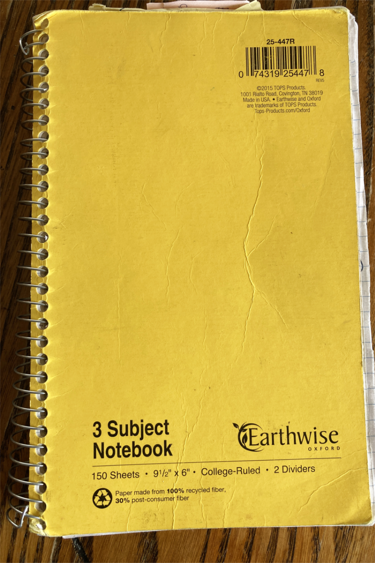 Around 2016 I bought a yellow Earthwise 25-447R, whose 150 pages are divided into three sections. It was manufactured in the U.S. of fully recycled materials and distributed by TOPS’ Oxford brand — those familiar makers of the “iconic index cards, composition books, and study tools that propel so many from classroom to career,” as the marketing folks say (completely ignoring the dilettantes who also pay money for their products). It cost $5.79 plus Maine sales tax. That model is still in production, but now costs twice or even three times as much.