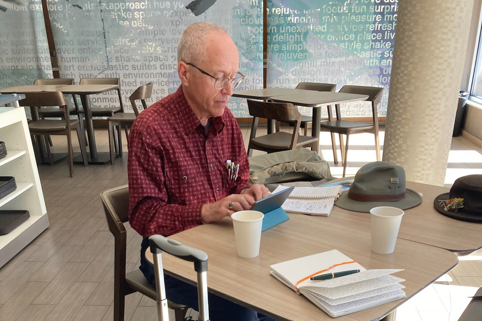 Typing up new lyrics out of the Earthwise notebook. The location is one of my favorite kinds of places to work: a hotel lobby. (Gretchen Schaefer photo)