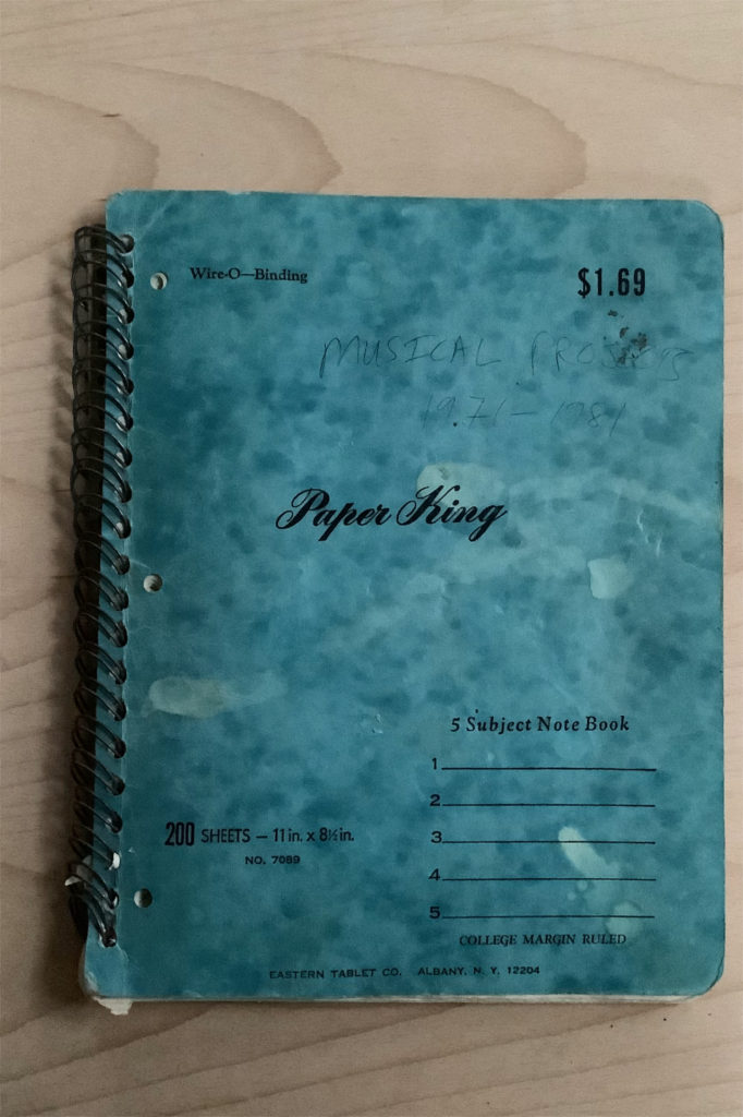 (One especially evocative example is a 200-page Paper King complete with proprietary Wire-O—Binding. Containing set and repertoire lists, a draft treatment for a short story that never got written, and lyrics — a few by me, many by artists my bands were covering — it spans 1971–1981. Most of the handwriting is mine, but it’s fun to try to identify the other scribblers.)