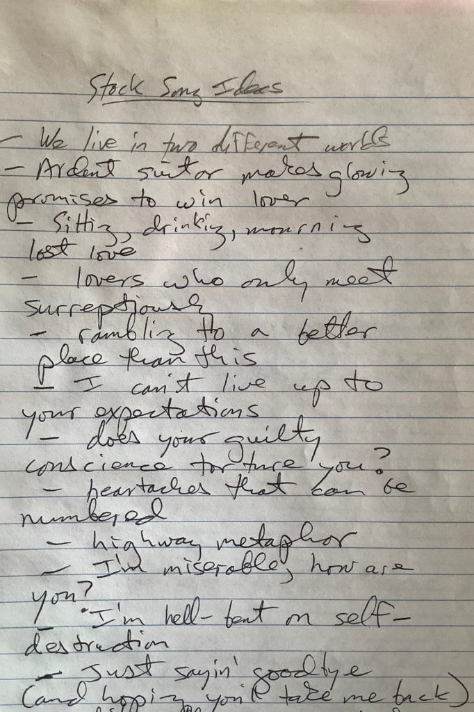 It’s reasonable to wonder where the line falls between productive songwriting practices on the one hand; and on the other, neurotic habits of list-making, idea hoarding, date-and-place notating and so on — activities that look like work, feel like work, take up time like work, but result in a big ink bill and no new songs.