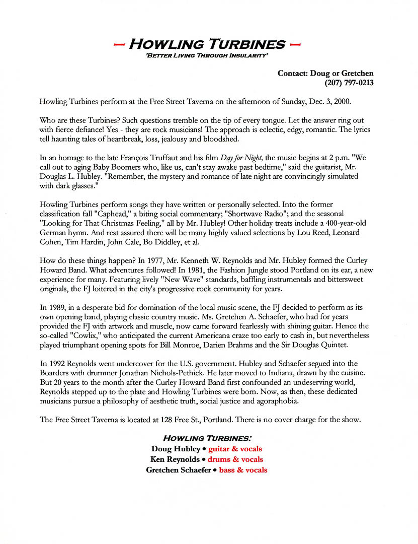 This Turbines poster for a December 2000 date was a group effort. Gretchen Schaefer created the Santa hats to superimpose on Jeff Stanton's image of the Howling Turbines, taken at the Free Street Taverna on a 90-degree day. I wrote and laid out the poster. Hubley Archives.