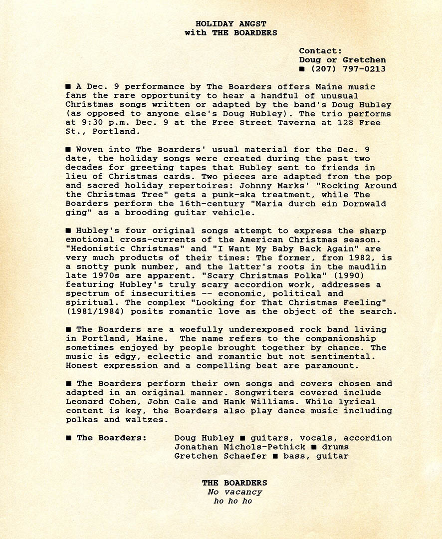 • Looking for That Christmas Feeling (Hubley) This performance is by the Boarders, in a Dec. 6, 1995, rehearsal for our Christmas date at the Free Street Taverna. Doug Hubley, guitar and vocal. Jonathan Nichols-Pethick, drums. Gretchen Schaefer, bass. Song note: In December 1981, I was stressed by finals and the demise of my current band, the original Fashion Jungle —but also all electrified by my new affair with Gretchen. That peculiar tension informs this song exploring the longing for some kind of meaning to Christmas that didn’t involve, well, Christ. Like “Shortwave Radio,” also from 1981, this involves closely personal imagery (I drank a lot of Freixenet that year), but I nevertheless hope it is somehow meaningful to others as well. The intro came later, in 1984 — coincidentally, again coinciding with the dissolution of a Fashion Jungle seemingly poised on the brink of success. The opening image was provoked by a spell of December warmth that had me worried about global warming even then. “Looking for That Christmas Feeling” copyright © 2010 by Douglas L. Hubley. All rights reserved.