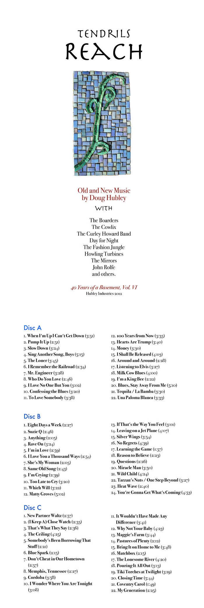 • Looking for That Christmas Feeling (Hubley) The Howling Turbines on Oct. 10, 2001, rehearsing for a Christmastime date at the Free Street Taverna. Doug Hubley, guitar and vocal. Ken Reynolds, drums. Gretchen Schaefer, bass. “Looking for That Christmas Feeling” copyright © 2010 by Douglas L. Hubley. All rights reserved.