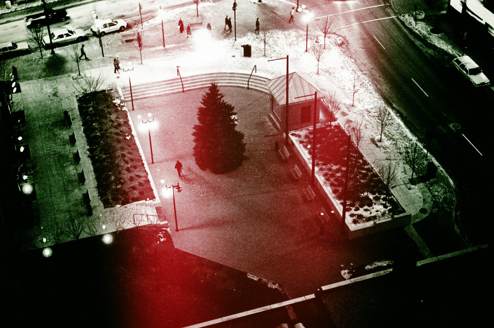 A digitally manipulated view of Congress Square Plaza in Portland, Maine, from the Top of the East in December 1984. Hubley Archives.