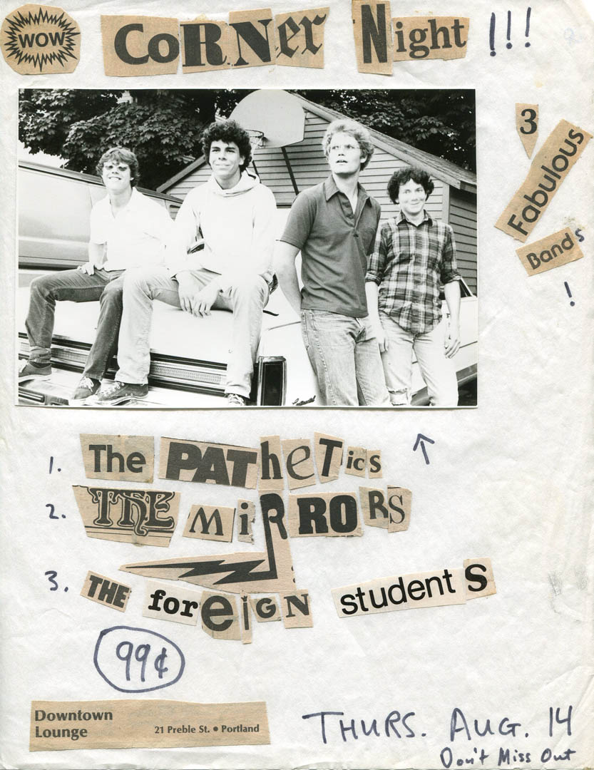 The Pathetix are featured in this poster for the 1980 Corner Night. At left, Gary Piscopo and Chuckie Frederick are the Pathetix who were with the band from first to last. I think, but am not sure, that the other guys are Rick Hendrickson and Terry McElroy. Hubley Archives.