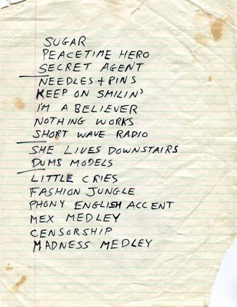 - She Lives Downstairs (Reynolds-Hubley-Piscopo-Sullivan) Like “Dumb Models,” this was a product of the short-lived “song-per-week” phase when everyone tried to bring in at least a musical fragment that we could work with. This is based around a typically earnest KR lyric. Note the nods to “Gloria” and “Gimme Some Loving.” MP, backing vocal, rhythm guitar. JS, backing vocal, bass.