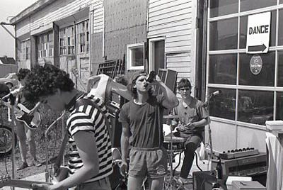 Mike performs with the Pathetix during a dance party in Ferry Village, South Portland, 1981. Image scanned from black & white negative/Hubley Archives.