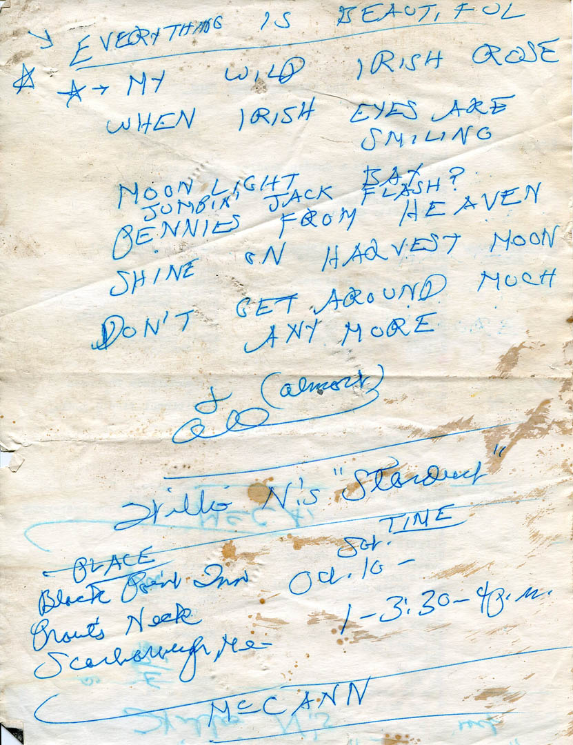 We learned “Daddy’s Little Girl,” “Moonlight Bay,” “Everything Is Beautiful” (which sparked up a great conga line there in the Black Point Inn) and similar schmaltz at the request of the wedding party — an ignominious end to a band founded in the rejection of blanditude.