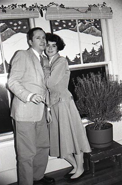 Gretchen and I dolled up and awaiting guests for the 1988 holiday party. Note the alpine window inserts that G. made. Photo by self-timer / scanned from black and white negative. Hubley Archives.