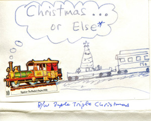• Scary Christmas Polka (Hubley) The one original song in this set, and the only one performed with a band. I wrote “Scary Christmas Polka” in 1990, during a period of unemployment and financial worry, and released it as a solo performance on that year’s Christmas Greeting Tape. In 1995, the Boarders learned it for a December gig and are performing it here in a rehearsal recording. Gretchen Schaefer plays bass and Jonathan Nichols-Pethick, drums.