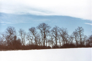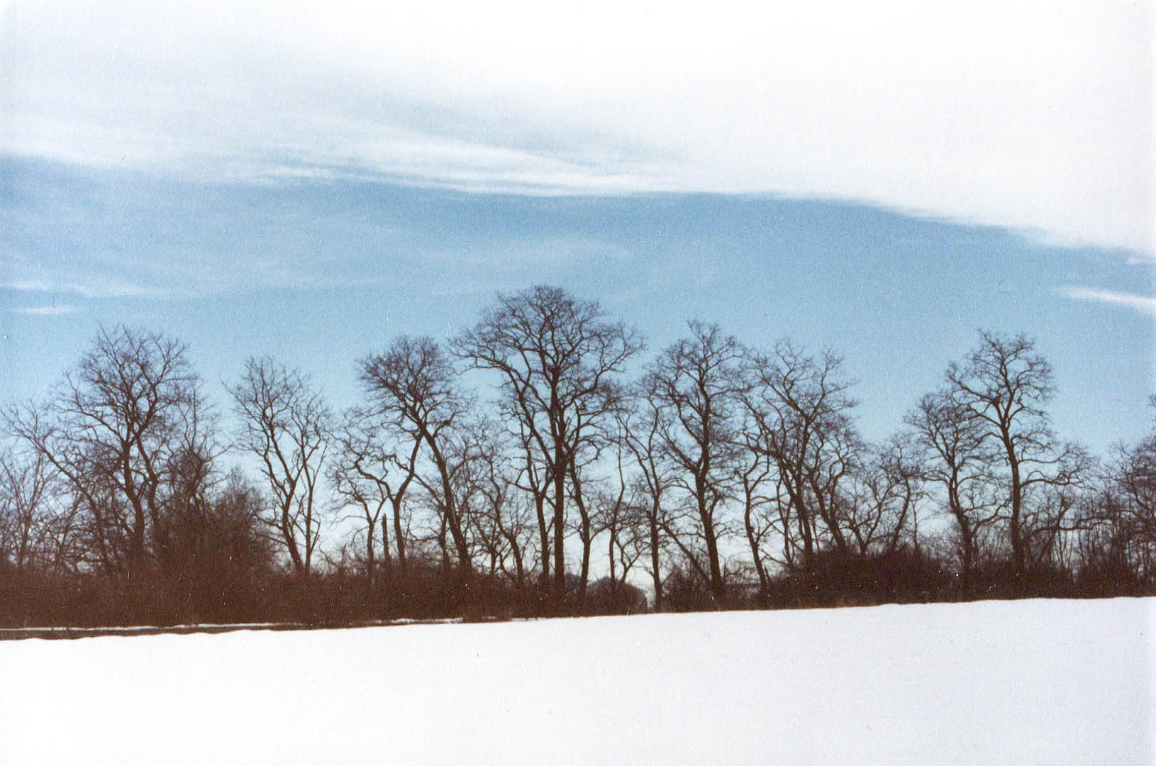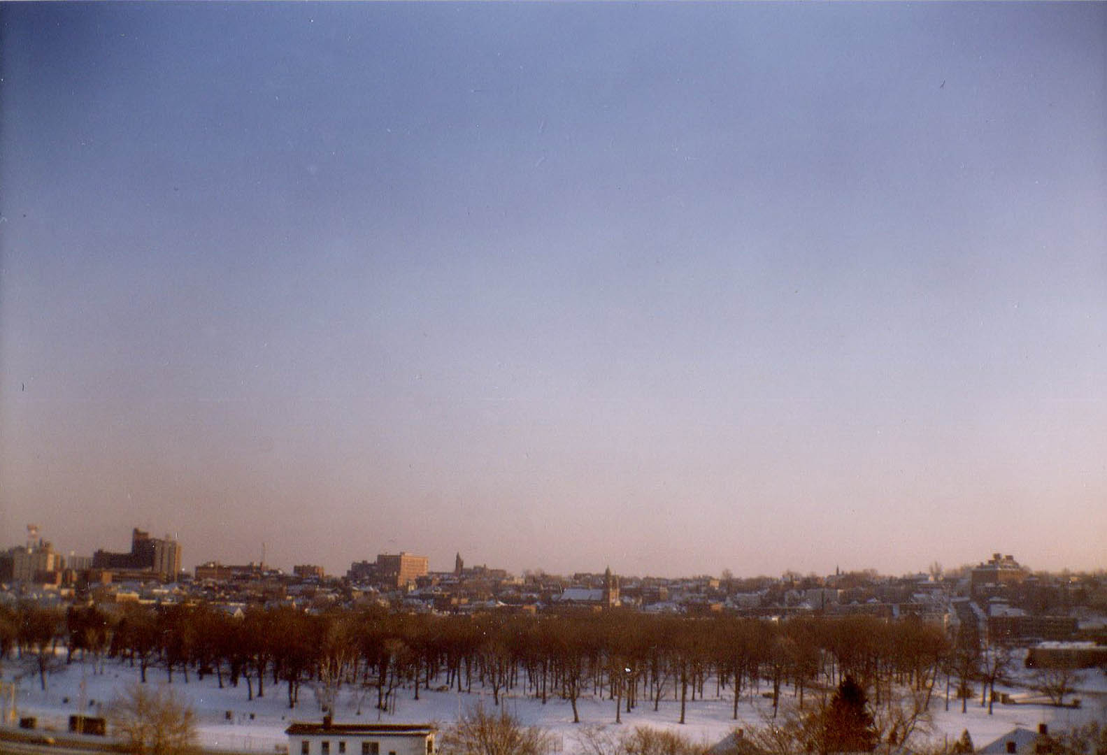 A wintery Portland seen from an upper floor at the University of Southern Maine, 1981. Camera: Kodak Brownie box model. Hubley Archives.