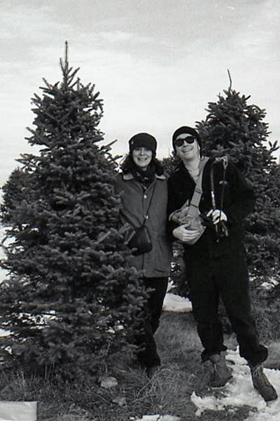 Posing with our prey at Merry Christmas Trees, Windham, in 1994. Photo by self-timer/scanned from black & white negative.