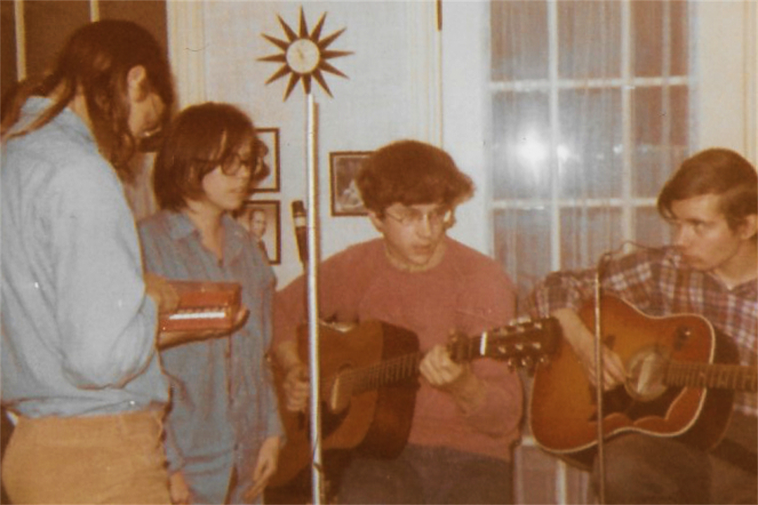 A recording session in Ben and Hattie Hubley’s living room in 1969. From left, Chris Church, Susie Hubley, Doug Hubley, Steve McKinney. The mic stands were tent poles. I still have the recording. (Hubley Family photo)