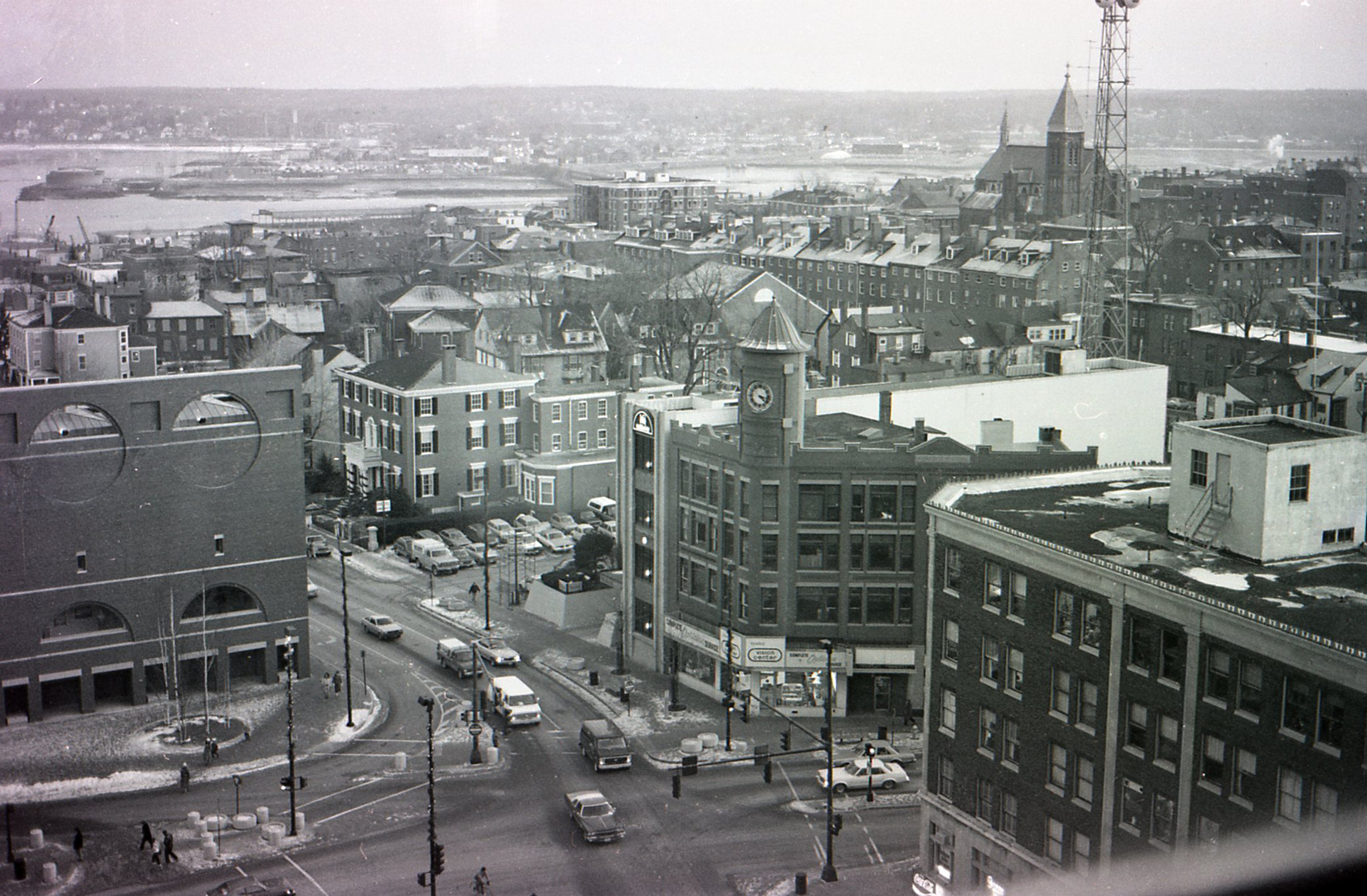 “We’re headed back East as we always must be / To the same old, and the good old, and the old used-to-be.” Portland, Maine, from the Top of the East cocktail lounge in January 1984. (Hubley Archives)