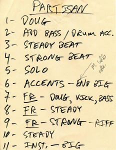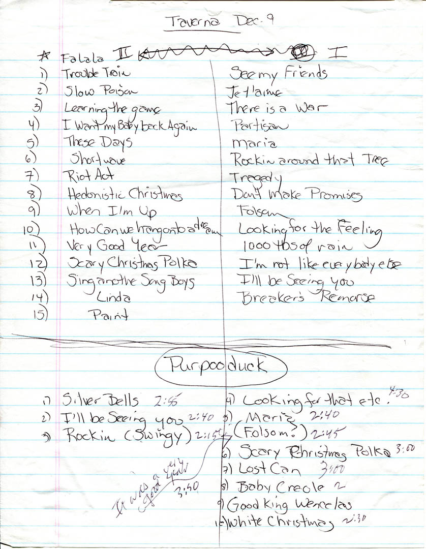 A Taverna setlist in Gretchen's handwriting. Hubley Archives.
