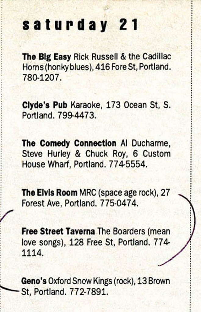 A Casco Bay Weekly listing for a Boarders gig at the Free Street Taverna, October 1995.