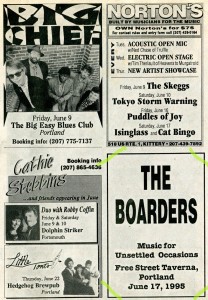 What a time that was. Against all evidence, I remain convinced of my coolness and cutting-edginess, but I really had it bad back then. During the Boarders’ first year, I was features editor at Maine Times — running out of steam by the time I got there, but still wielding its prestige, and frequently its value, as Maine’s first and foremost alternative newsweekly.