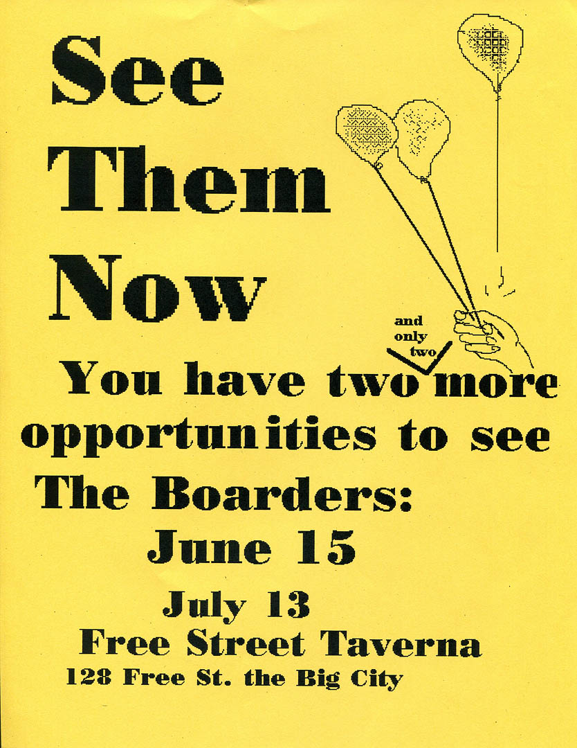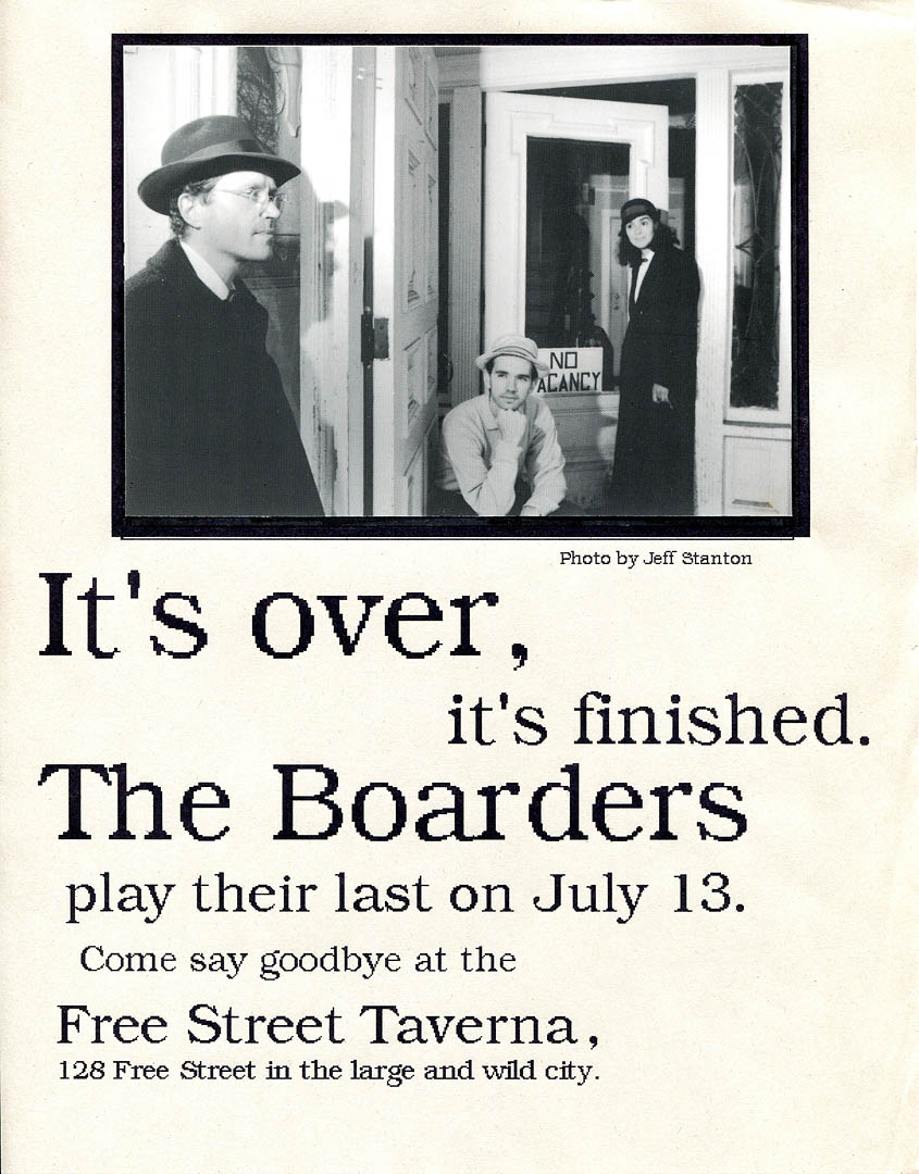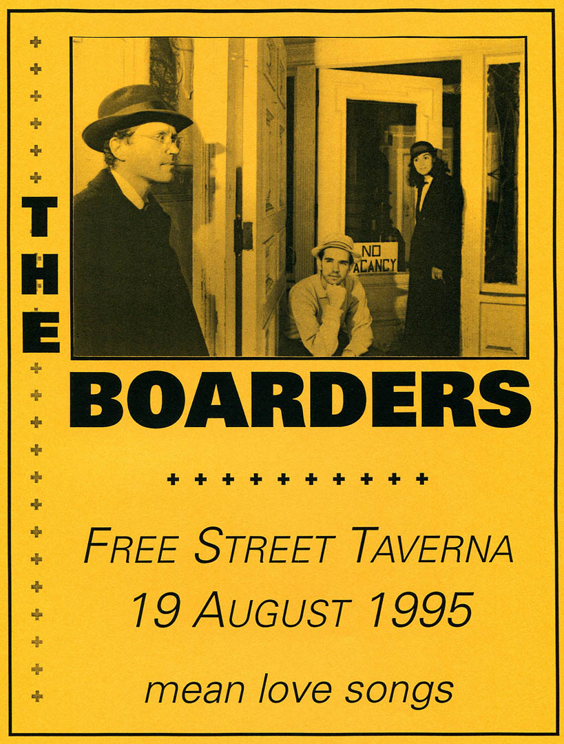 Following are three galleries dedicated to this band comprising singer-guitarist-accordionist Doug Hubley, drummer Jonathan Nichols-Pethick and bassist-singer Gretchen Schaefer that performed from June 1994 until July 1996 in Portland, Maine. Hear the Boarders at the Nimbit store.