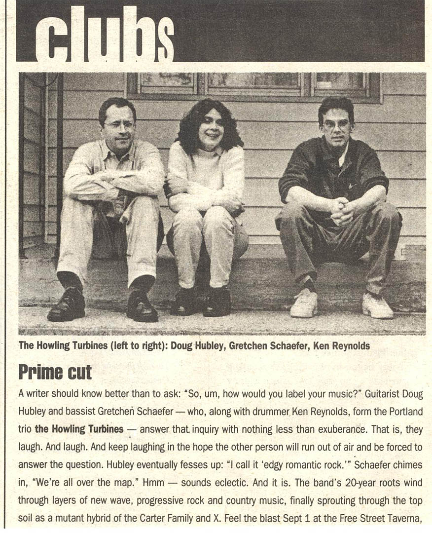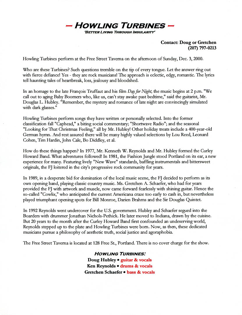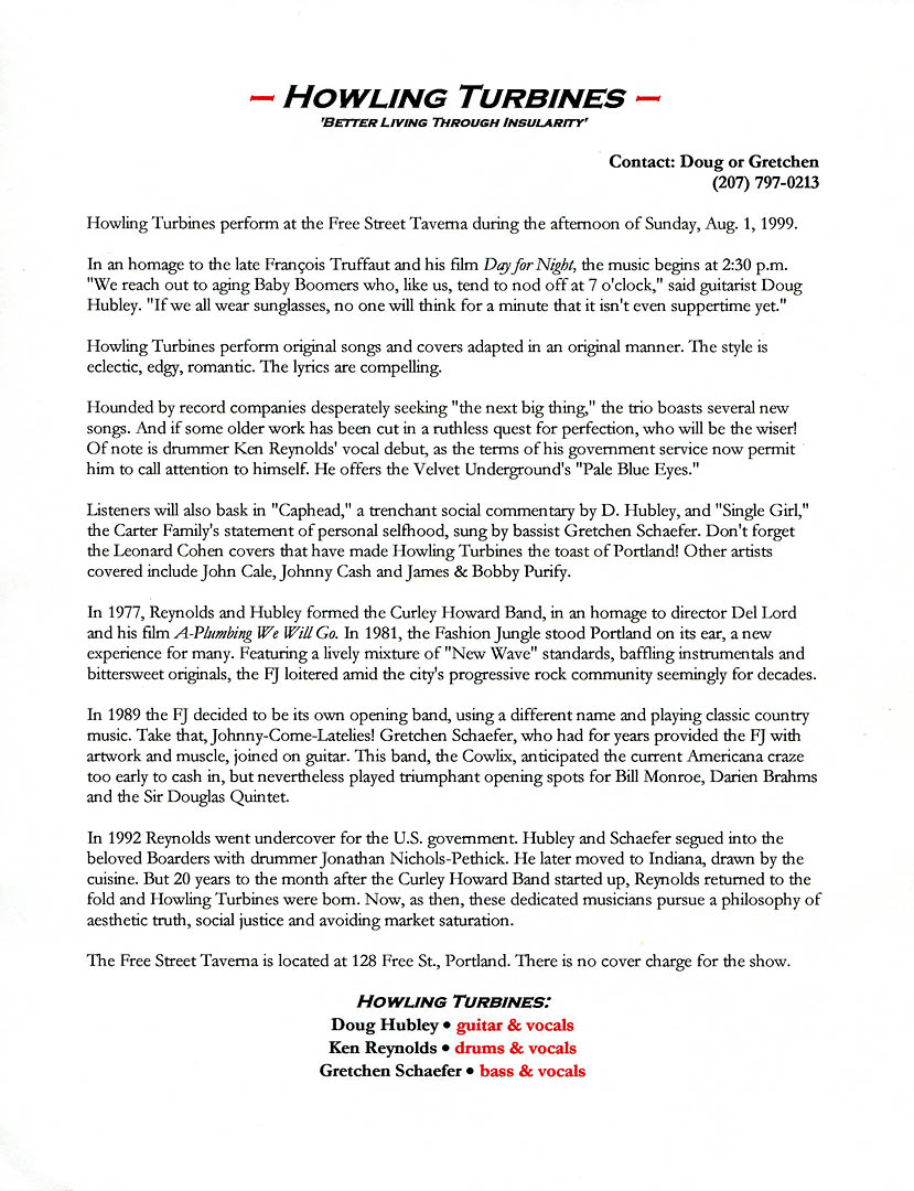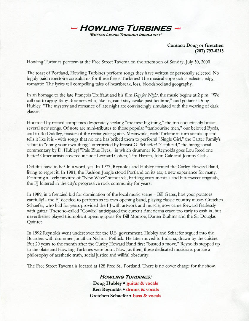 These four galleries show setlists, news releases, posters and photos of the Portland, Maine, rock trio composed of singer-guitarist-accordionist Doug Hubley, drummer Ken Reynolds and bassist-singer Gretchen Schaefer. The Turbines were around from February 1997 until April 2004. Hear the Turbines at the Bandcamp store.