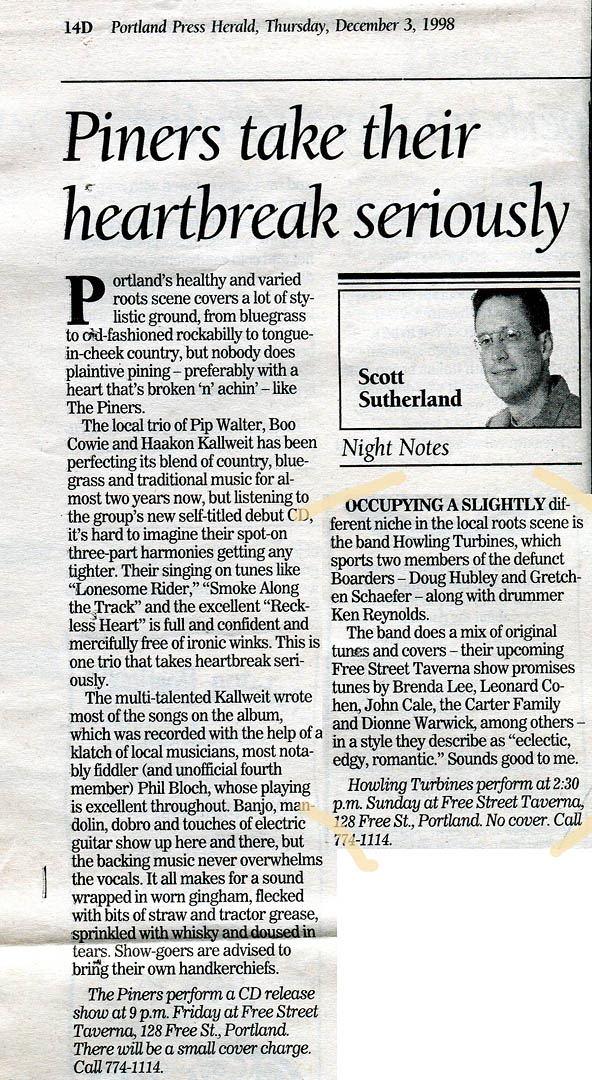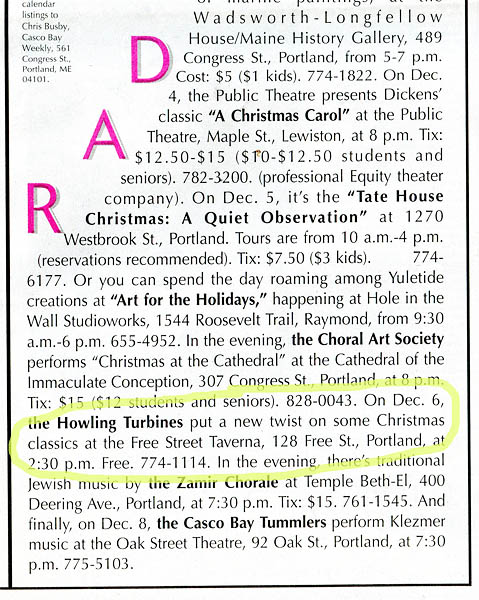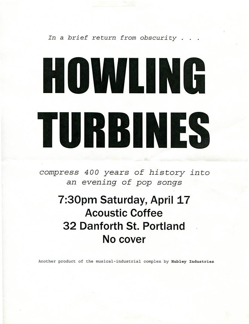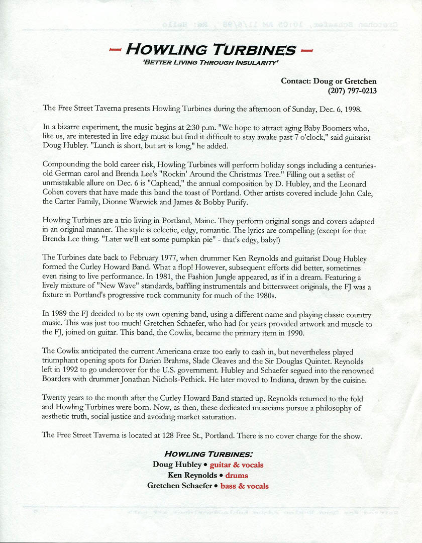 These four galleries show setlists, news releases, posters and photos of the Portland, Maine, rock trio composed of singer-guitarist-accordionist Doug Hubley, drummer Ken Reynolds and bassist-singer Gretchen Schaefer. The Turbines were around from February 1997 until April 2004. Hear the Turbines at the Bandcamp store.